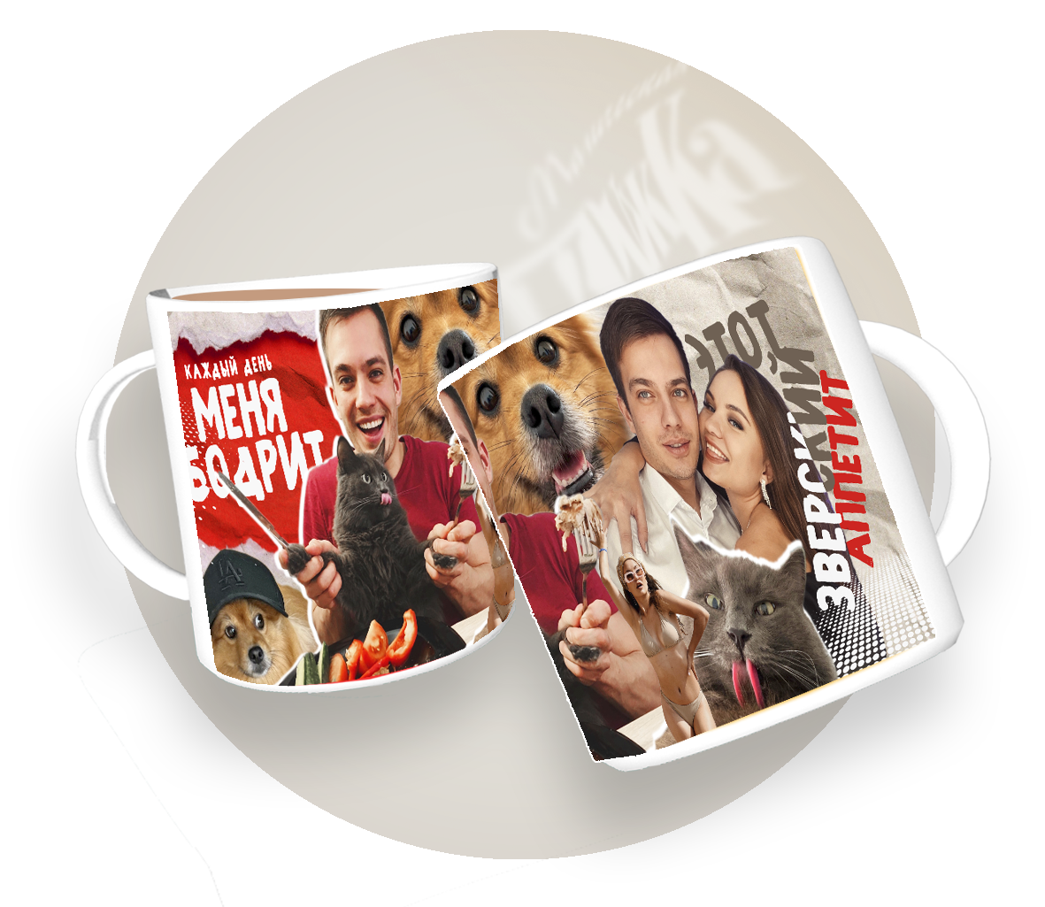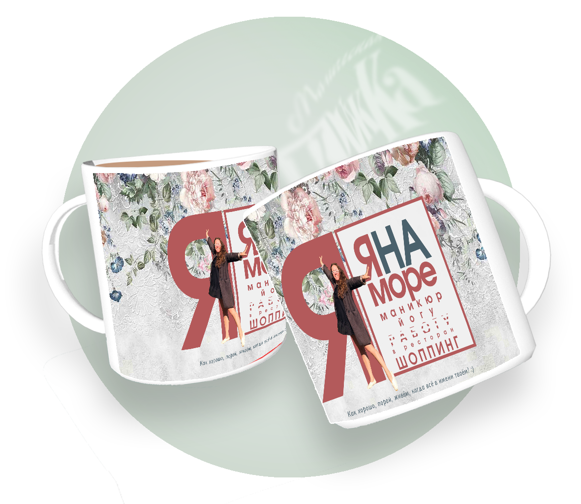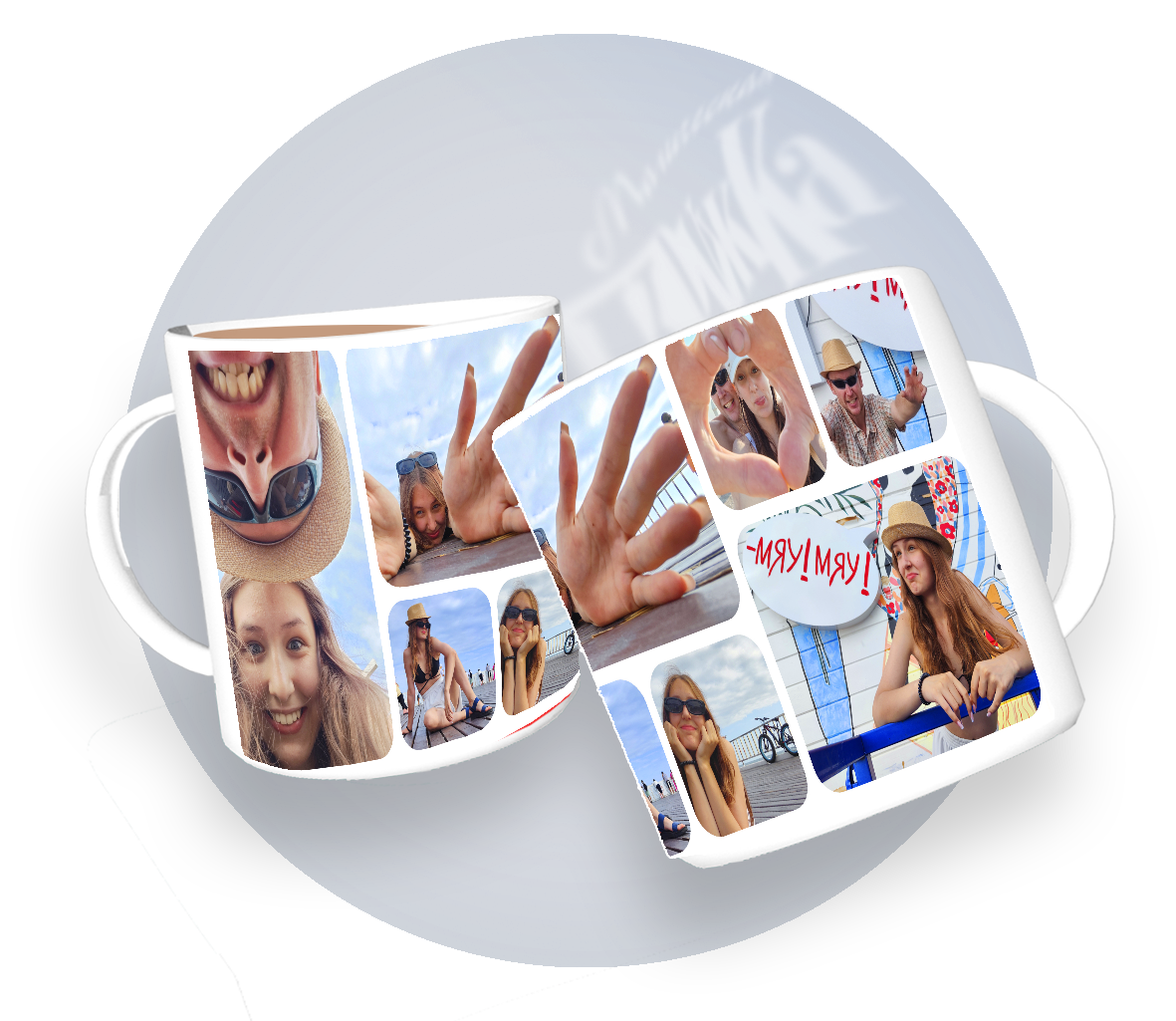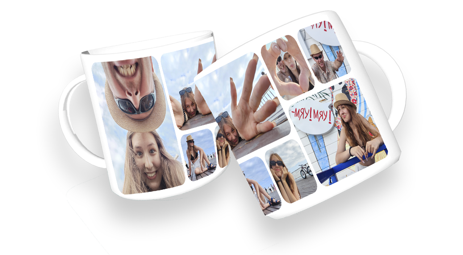 Больше фото, но без текста и элементов дизайна. Красиво, если собрать коллаж из 4-7 фото. Меньше – кружка может смотреться «пустой». Больше – фотографии окажутся слишком мелкими.